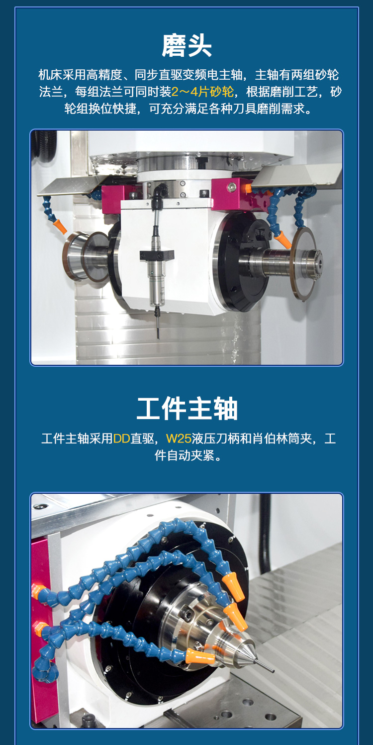 QD680六軸五聯(lián)動(dòng)數(shù)控工具磨床,適用于生產(chǎn)或修磨小規(guī)格銑削類刀具、鉆削類刀具、成形刀具等